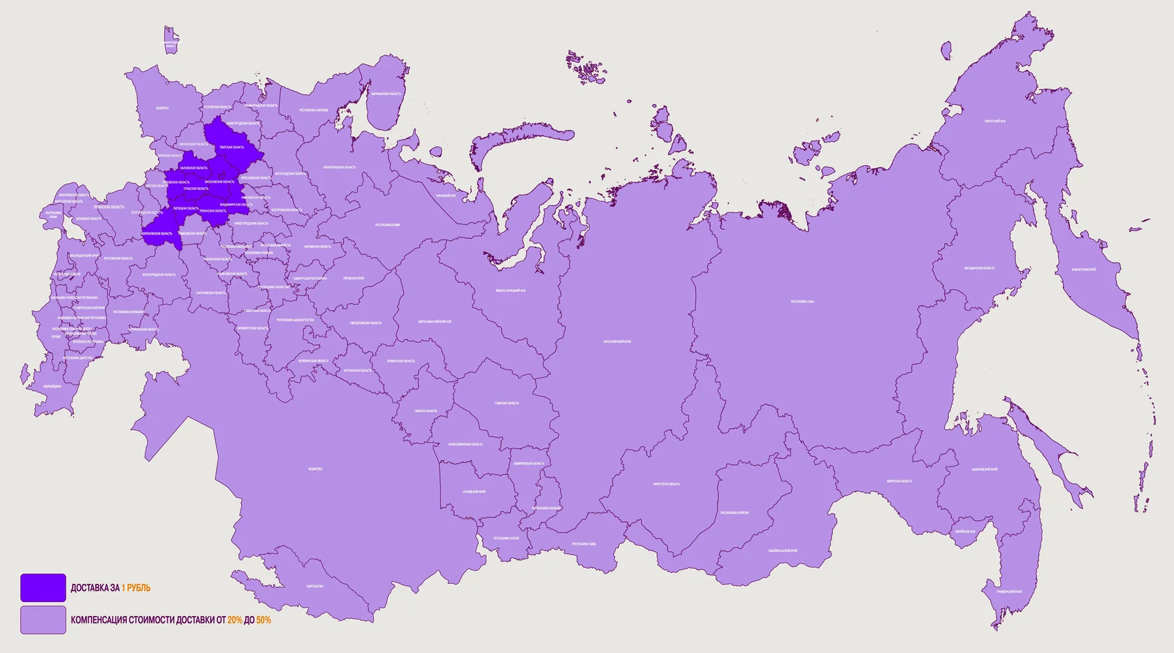 - компенсация доставки от 20 до 50% - в регионы, выделенные светлым оттенком.